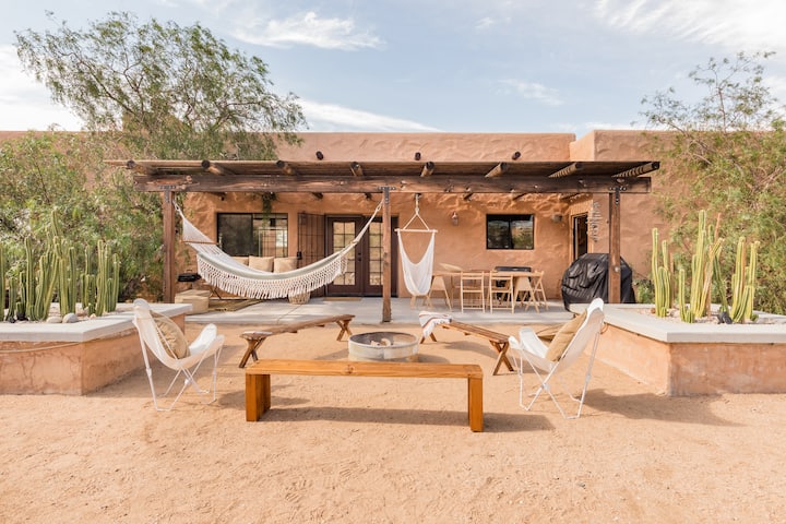 Relax into the slow pace of desert life at this cozy home, with some bocce on the custom court at a laid-back haven! Take it easy in one of 3 hammocks perched on the hill with views of the valley below.